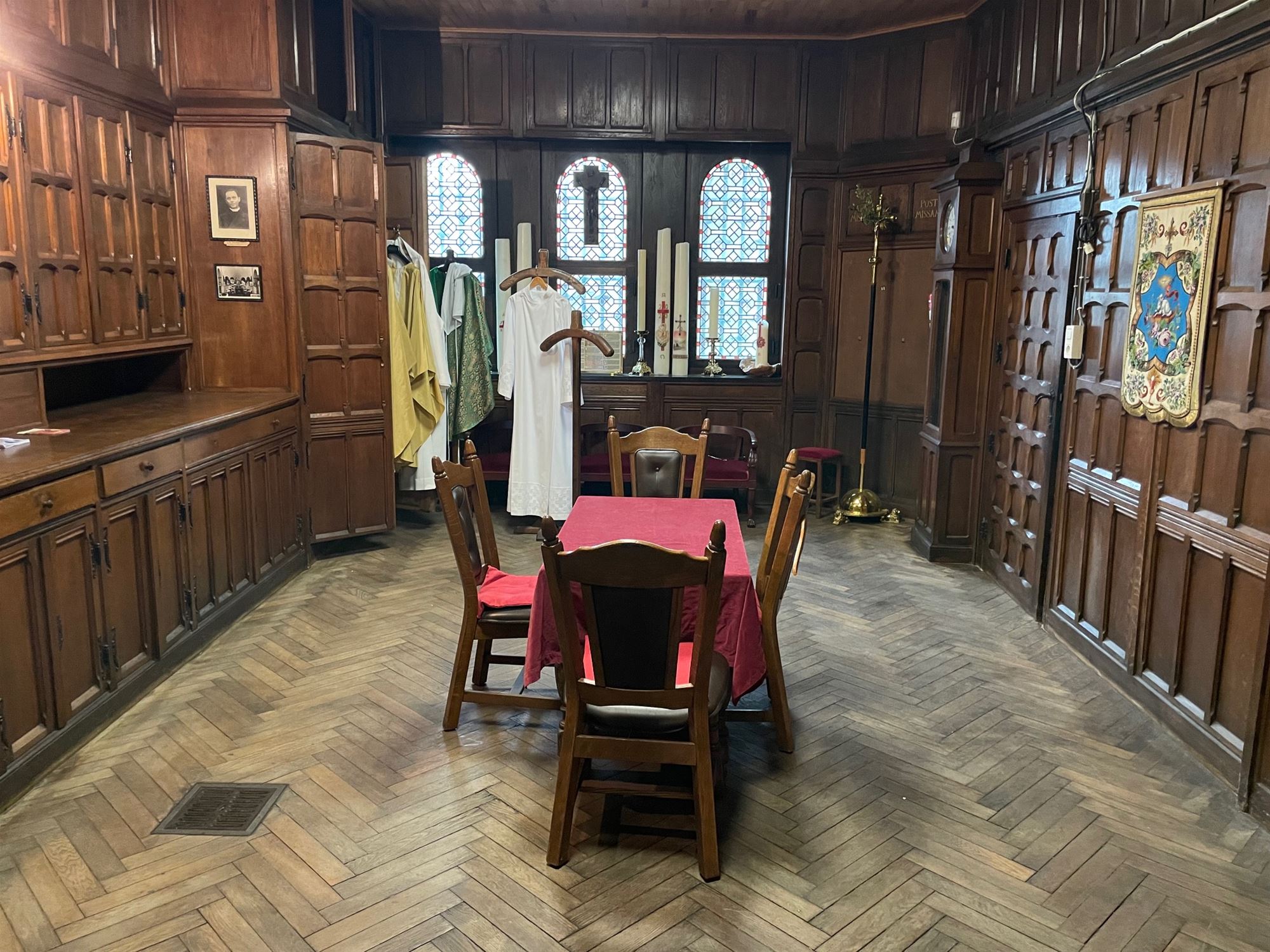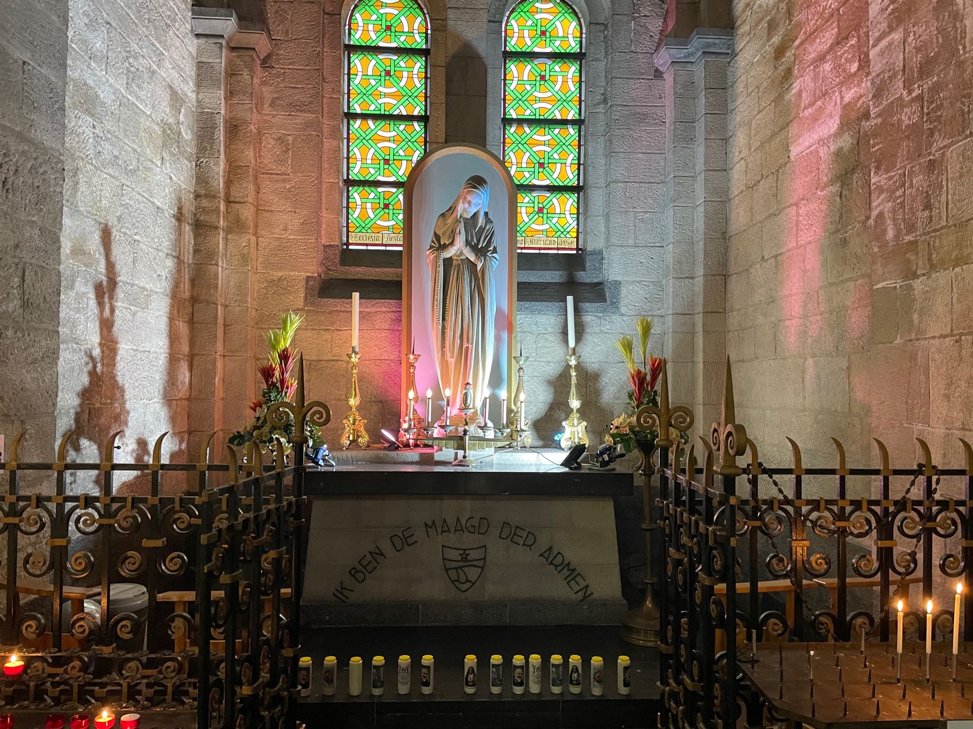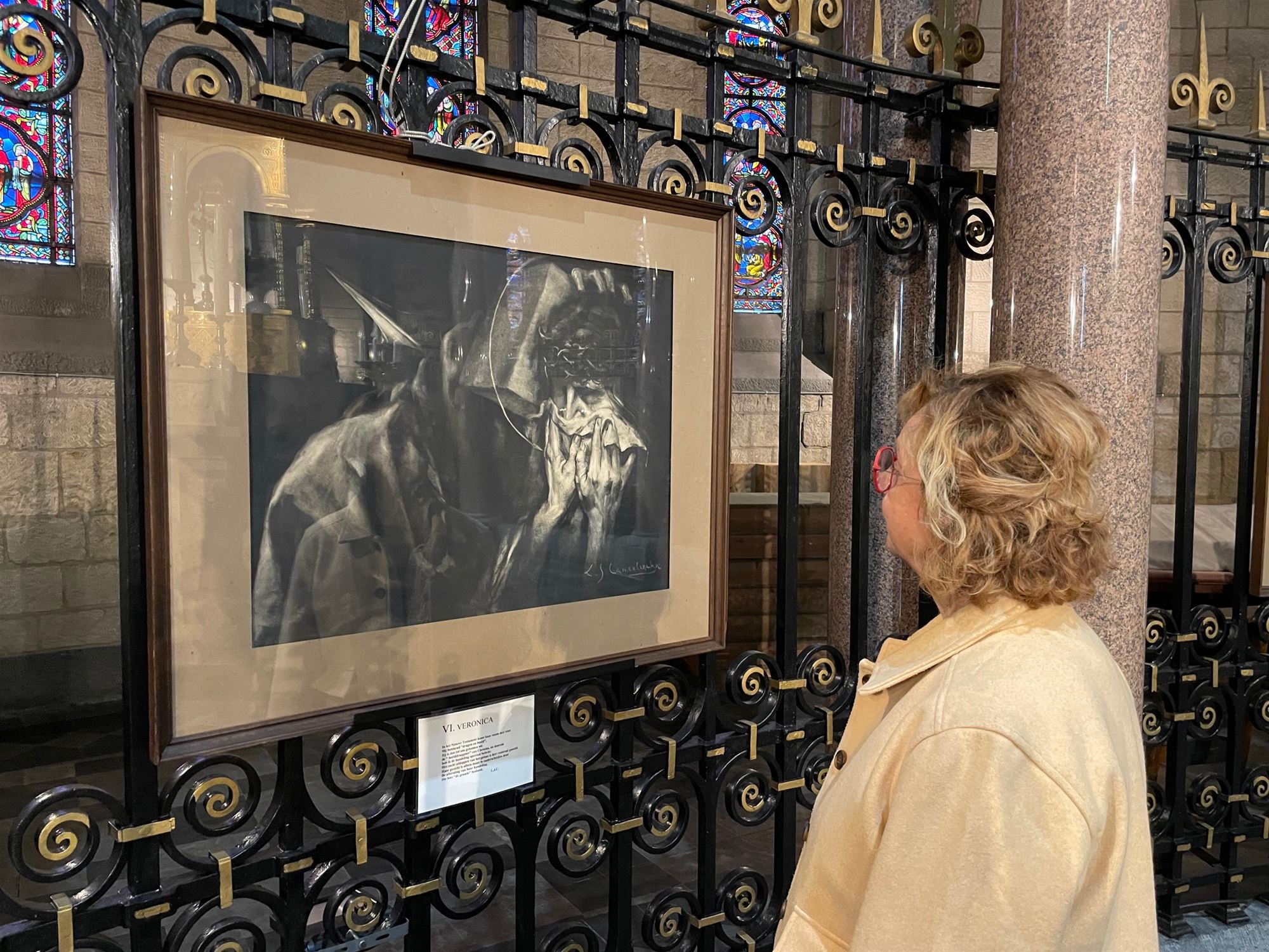 unieke kruisweg van kunstenaar Louis Jacques Camerlinckx. Deze werd geschilderd in 1945 en toont in zwart-wit een zeer creatieve en sprekende kruisweg. De houtskooltekeningen spreken een zelden geziene kracht uit.