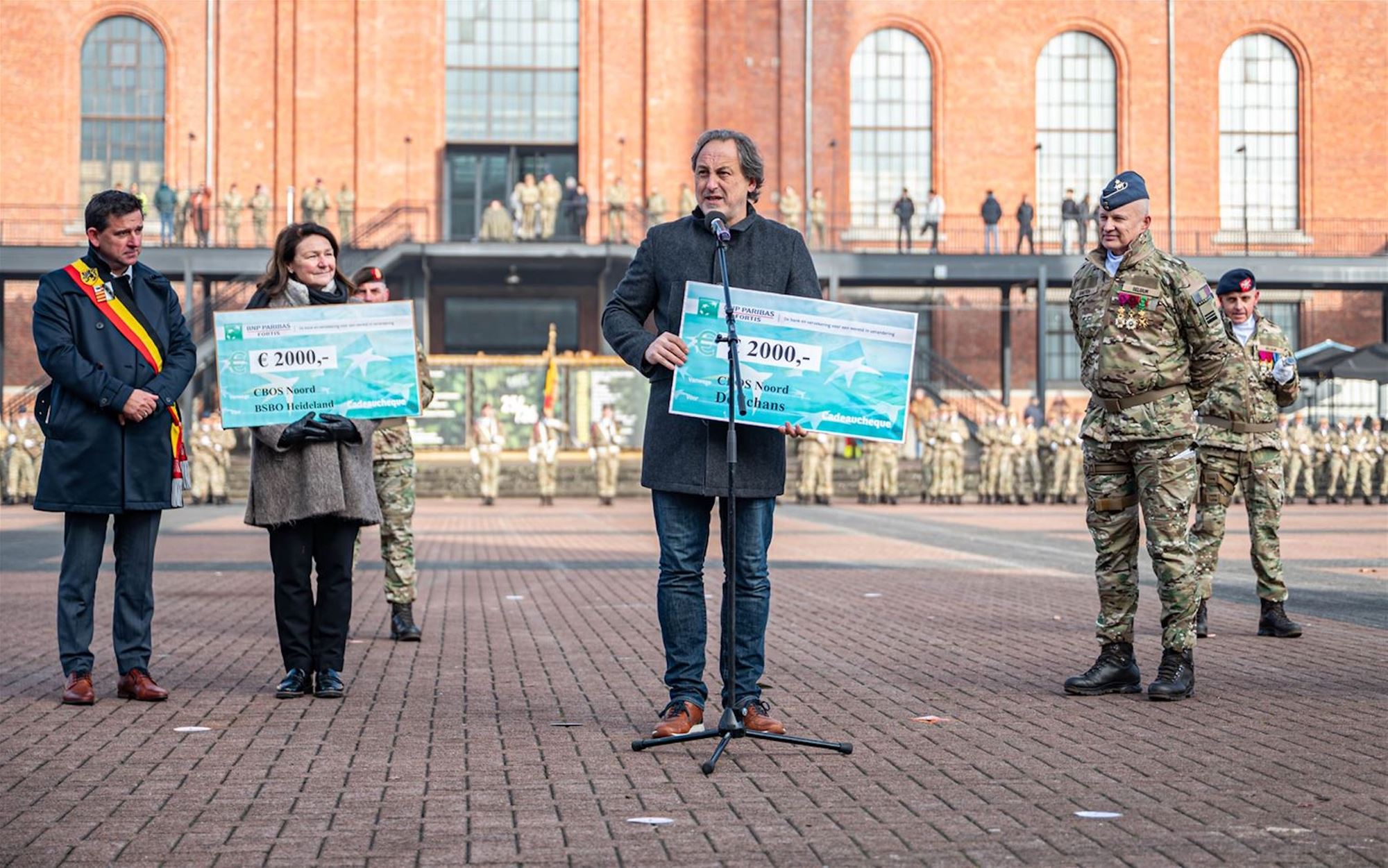 verbroedering van de gemeente Heusden-Zolder met de legereenheid uit Leopoldsburg die precies 60 jaar bestaat. Commandant Bart Grieten en burgemeester Mario Borremans overliepen kort de geschiedenis van dat peterschap en hadden lof voor de rol van defensie en het maatschappelijk engagement. Dat laatste werd meteen in de praktijk gebracht door luitenant-kolonel Grieten die twee cheques van 2.000 euro had voor Dagactiviteitencentrum De Schans en BSBO Heideland, de opbrengst van hun jaarlijkse fietshappening. Afgevaardigden van beide instellingen toonden zich erg dankbaar voor de weerkerende steun, die van pas komt want beide krijgen niet alles gefinancierd met subsidies. Even later mochten ze nog eens naar voor komen, want de militairen in opleiding hadden een koekjesverkoop gehouden en dat bracht nog eens voor elke organisatie 3.000 euro in het laatje. Opvallend was ook de groep leerlingen van de richting Veiligheid van het Sint-Franciscuscollege, onder leiding van militaire kwamen ook zijn opgemarcheerd en namen hun plaats op het plein in.
