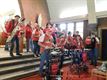 (boven). Heel veel leden gaven gehoor aan de oproep en kwamen, in wedstrijdoutfit, naar de hal. Een hele bende, jong en iets ouder, bij elkaar!