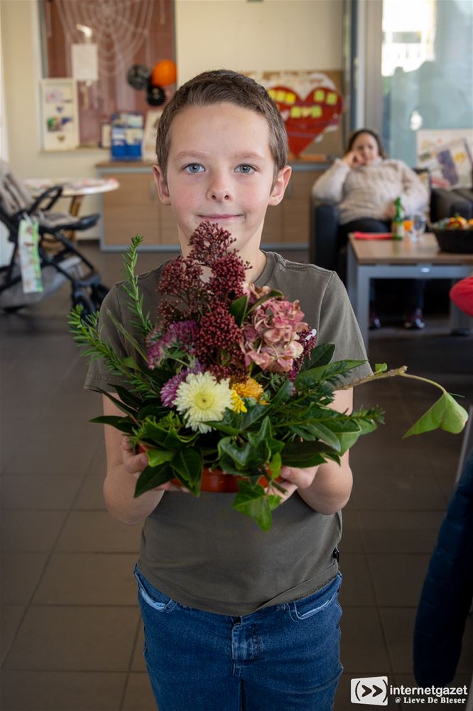 Elena, Tristan en Milow (foto boven) deden enthousiast mee. Elena en Tristan kwamen samen met hun oma Marianne, en Milow met zijn meter Jessica. Ze gingen alle drie vol overgave aan de slag en maakten hun bloemstukje helemaal zelf. Echt knap hoe ze hun eigen ideeën volgden en met veel creativiteit elk een uniek werkje in elkaar staken!