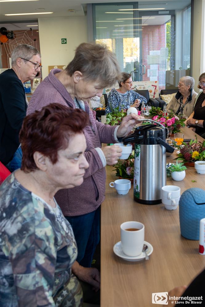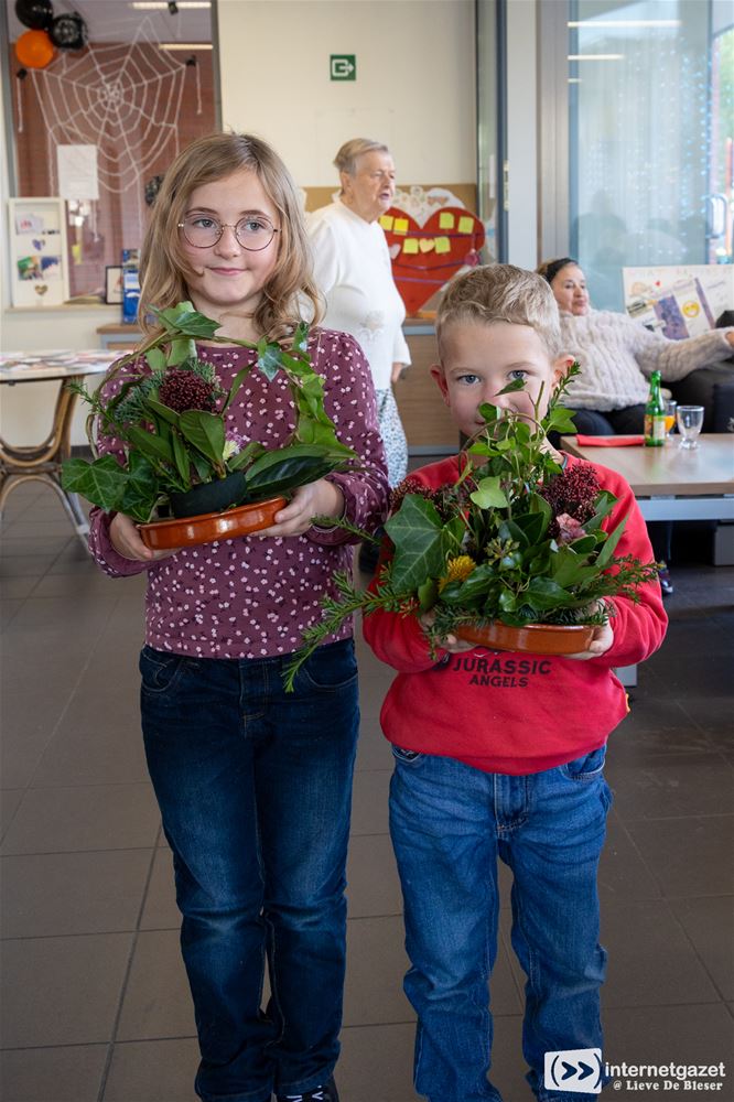 De tafel zat goed vol met enthousiaste, creatieve dames én enkele kinderen, die met klimop, groenblijvende takken en kleurrijke bloemen een prachtig grafstukje maakten. Iedereen ging zelfstandig aan de slag en toverde, helemaal op eigen houtje, een mooi kunstwerkje tevoorschijn dat ze nadien trots mee naar huis mochten nemen.