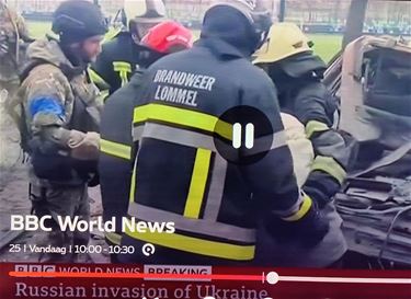 in het BBC-nieuws, in een verslag over de oorlog in Kiev, plotseling een brandweerman te zien was die