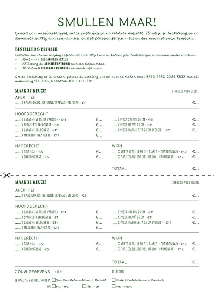 Wie zijn bestelling komt ophalen in Lommel (Klosterhof), kan bovendien gezellig blijven hangen voor een drankje in het Elkeencafé en kan meteen zijn kans wagen bij een superleuke tombola.