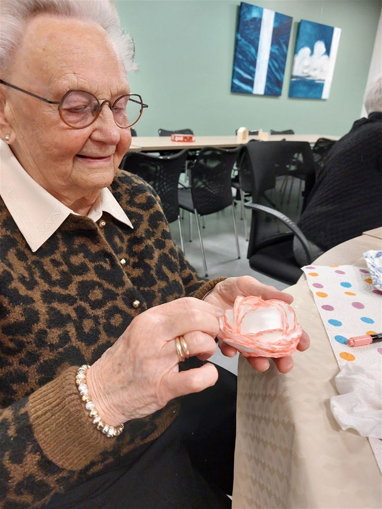 Aan het einde van de namiddag ging iedereen tevreden naar huis, met een warm gevoel én een prachtig versierd schaaltje met roosje als tastbare herinnering aan een geslaagde start van het creatieve jaar. (Louisa Willekens)