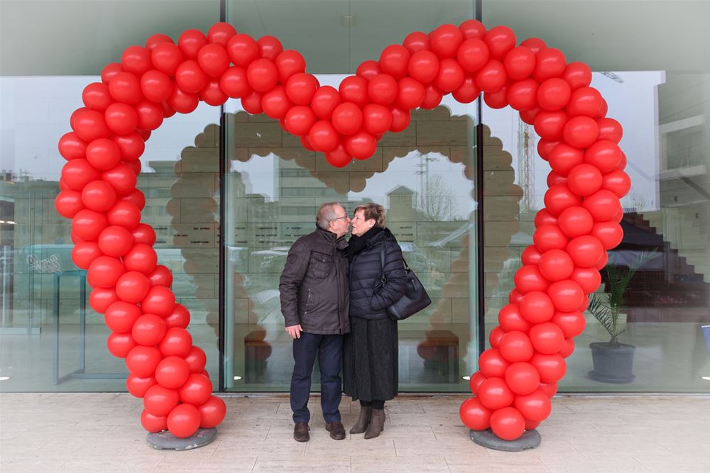 groot hart, gemaakt van rode ballonnen bij. De stad voegde de daad bij het woord, en dat grote rode hart werd vandaag opgesteld op de woensdagmarkt. Vanwege het slechte weer moest het helaas onderdak vinden bij de trappen naar de ingang van het Huis van de Stad. Maar niet getreurd, er waren toch enkele koppels en gezinnen die even voor de camera hun liefde voor elkaar wilden betuigen. Mooi toch!
