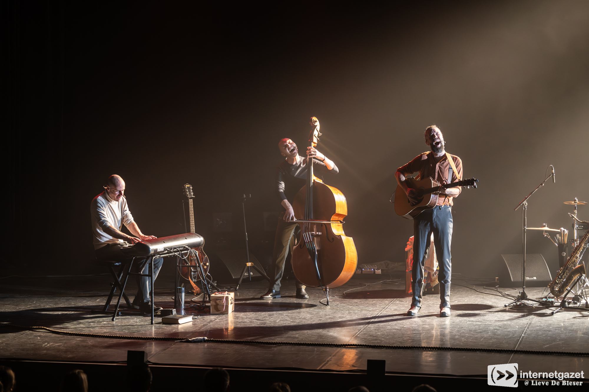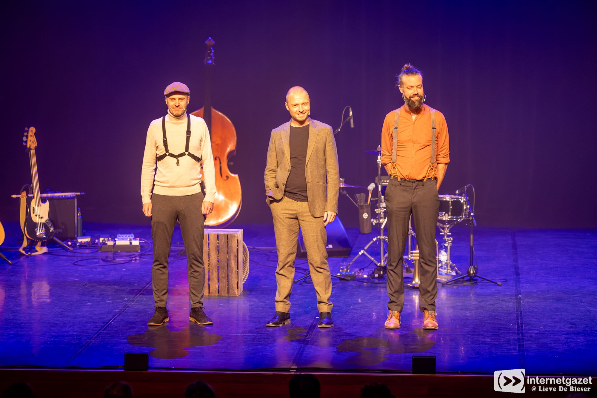 “bijna-akoestisch muzikaal cabaret met serieuze humor en onnozele ernst”. Vrolijk muziektheater, gebracht door drie enthousiaste muzikanten met een pak bagage en vooral veel goesting.