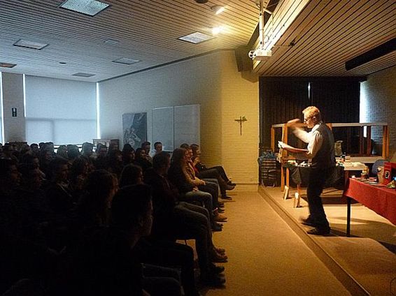 Zijn unieke aanpak sloeg duidelijk aan bij de vijfdejaars die zijn creativiteit wisten te waarderen. Holvoet-Hanssen is een meester in het improviseren en hij weet dan ook als geen ander in te spelen op het publiek. Deze interactieve voorstelling werd erg op prijs gesteld.