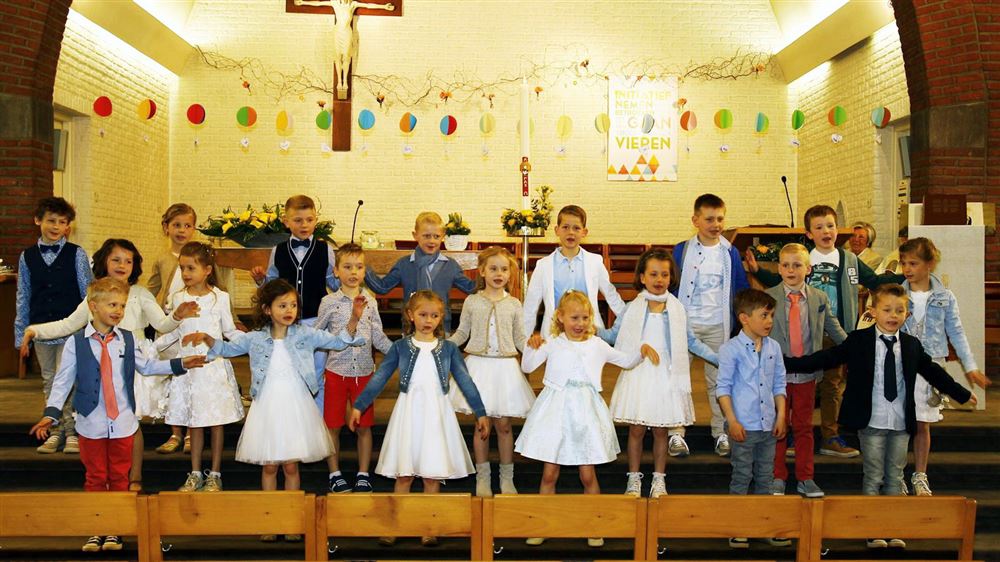 eerste communie in de kerk van de parochie met mooie tekstjes en vrolijke liedjes. Na de viering werden nog 20 witte ballonnen opgelaten en was er in de aangrenzende lagere school een receptie voor alle aanwezigen.