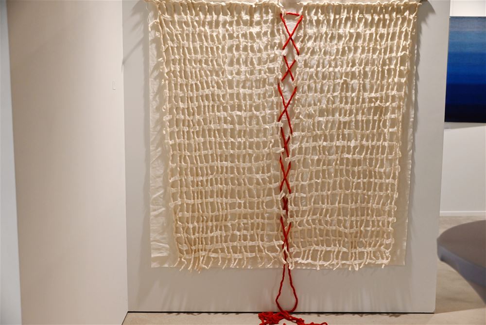 Vezels - In tijd verweven' van Lucie Haentjens, in de expo-ruimte van CC De Adelberg. Deze expo is te bezoeken nog