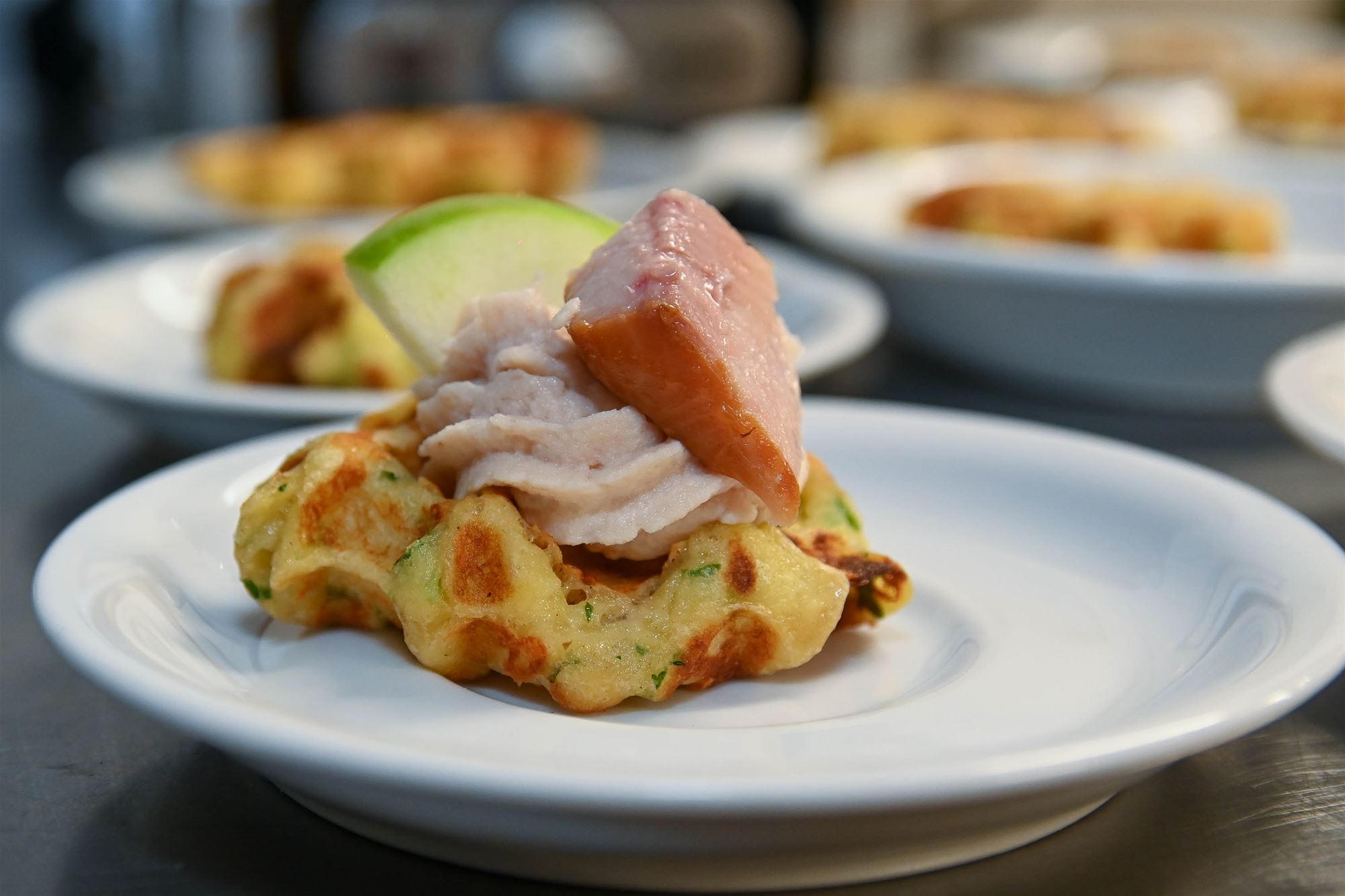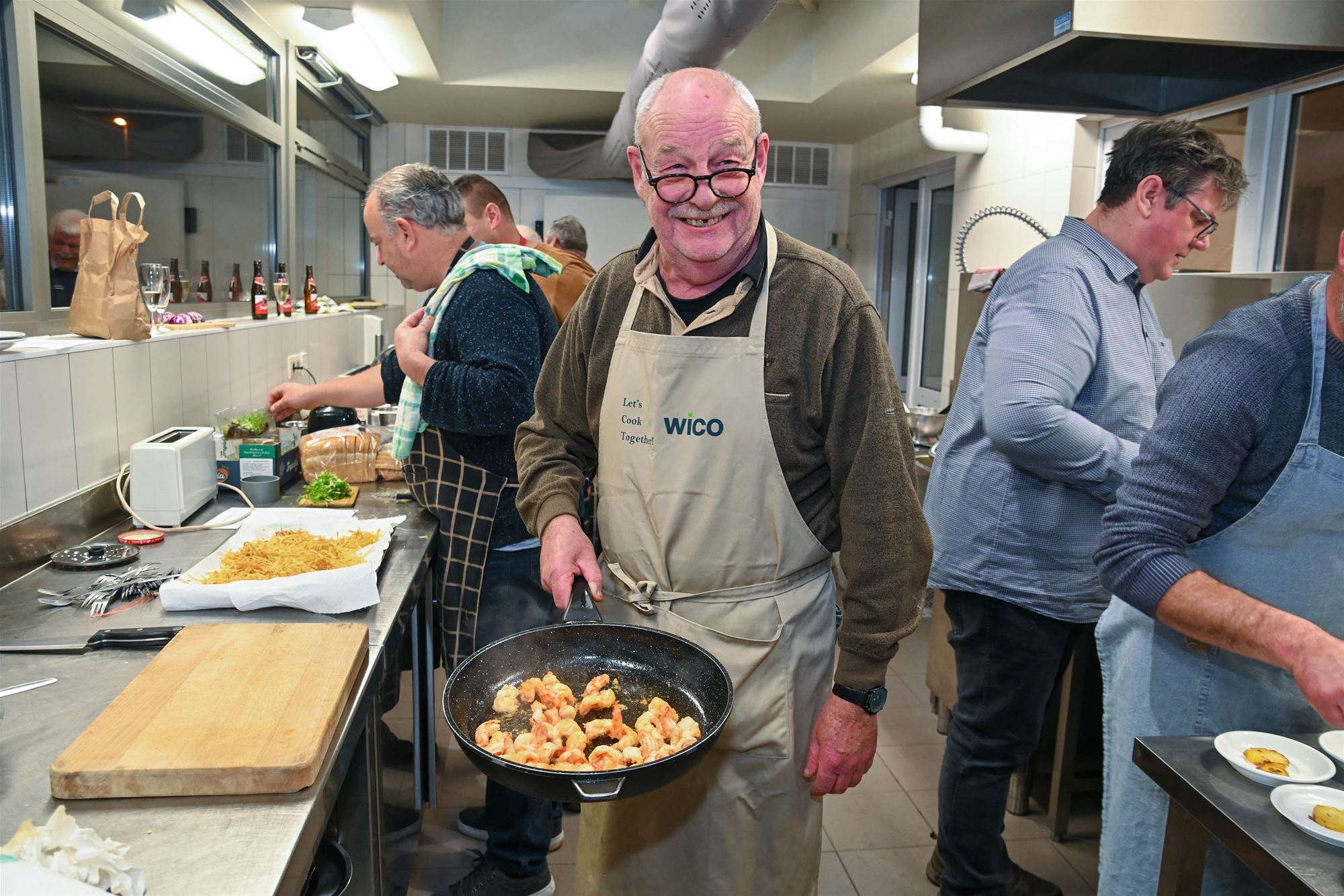 hapjes: een toastje met zwarte pens, patatas bravas met scampi en een aardappelwafeltje met paling. De koks konden tijdens het bereiden al genieten van hun eigen creaties. Daarna was het tijd om aan tafel te gaan en samen van het volledige menu te proeven.