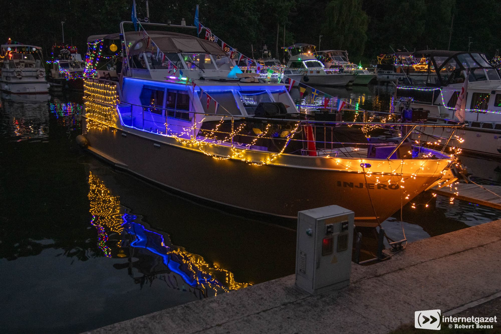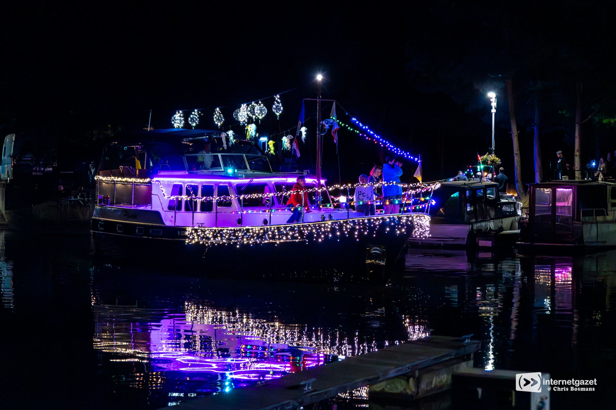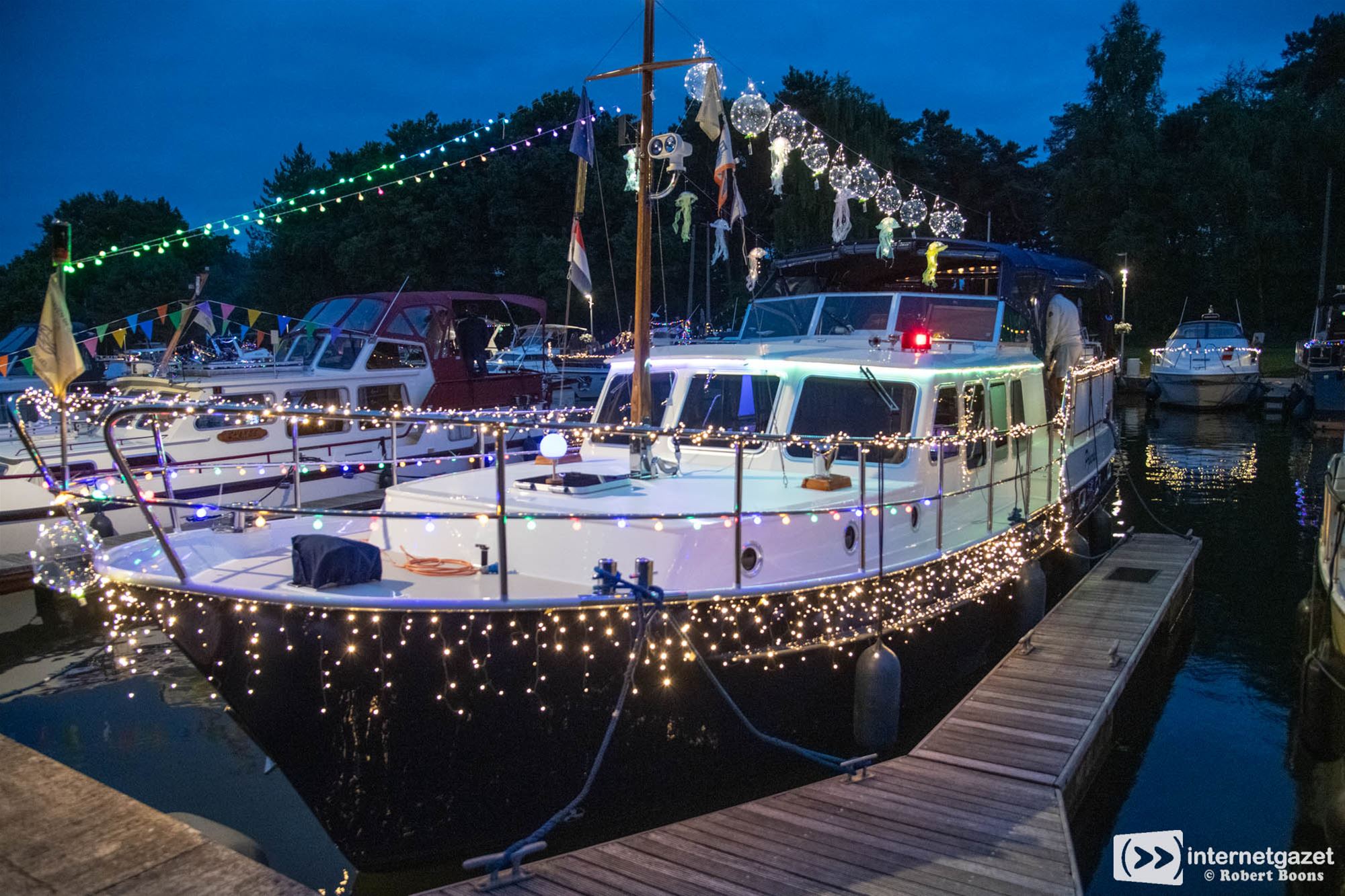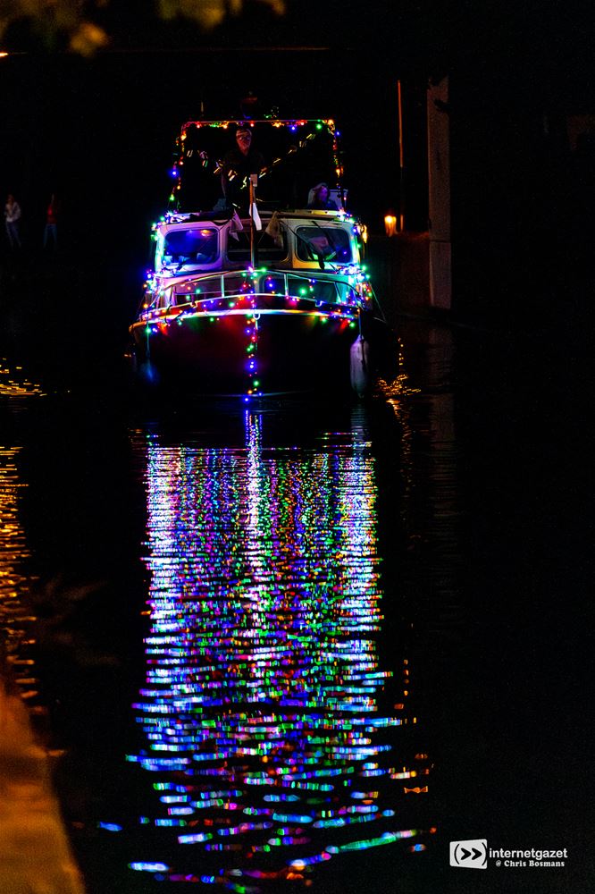 lampionnentocht. Boten, schitterend versierd met honderden lichtjes, voeren richting Overpelt fabriek, tot aan de Velbo en weer terug. Een feeëriek schouwspel dat heel veel volk kwam bewonderen vanaf het terras van de Brasserie of vanop het jaagpad langs het kanaal.