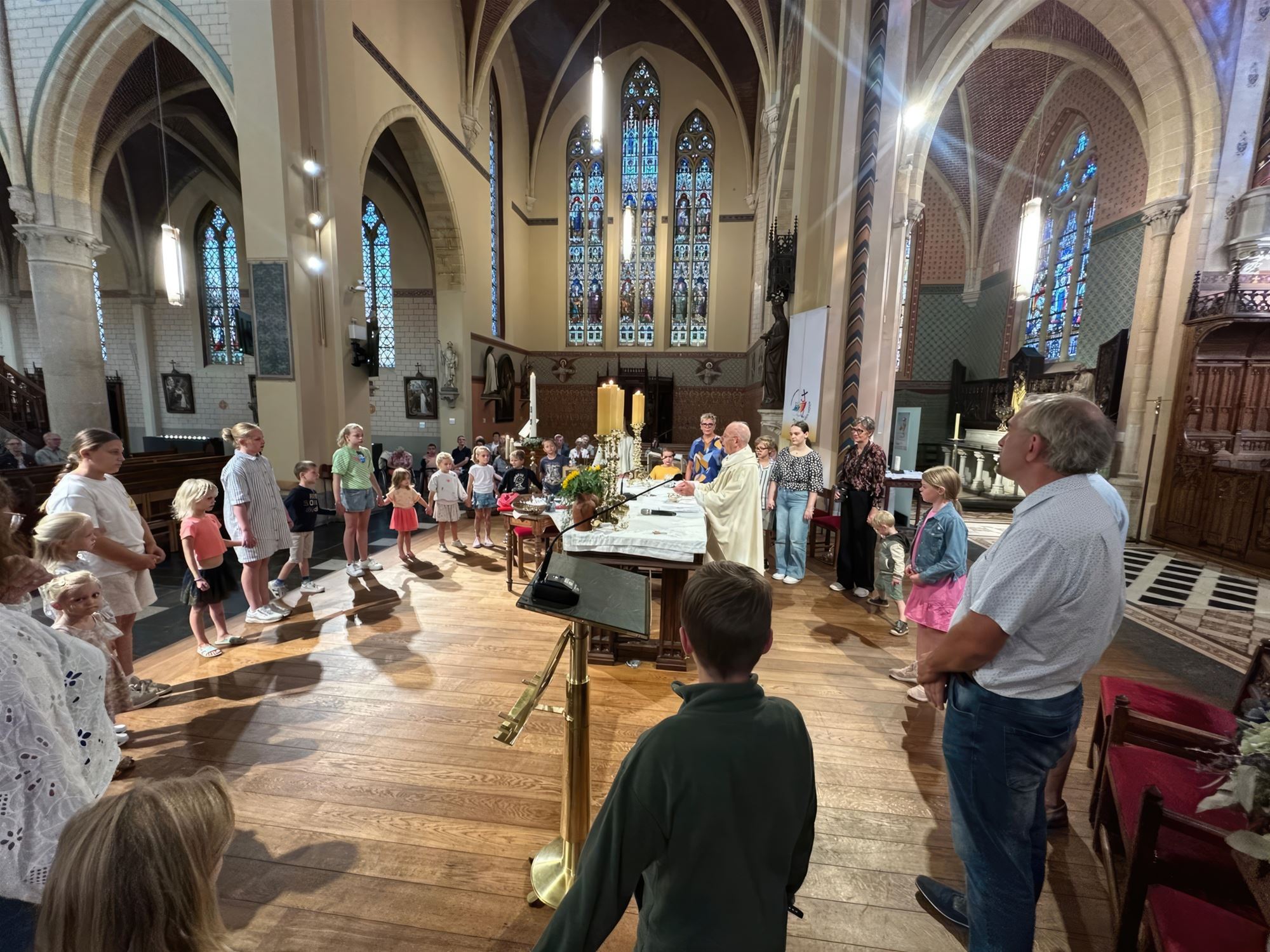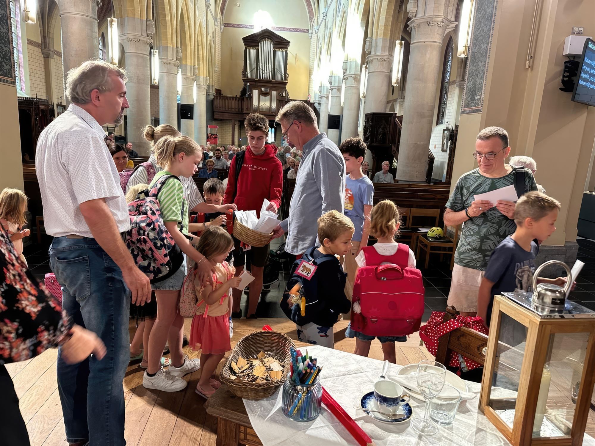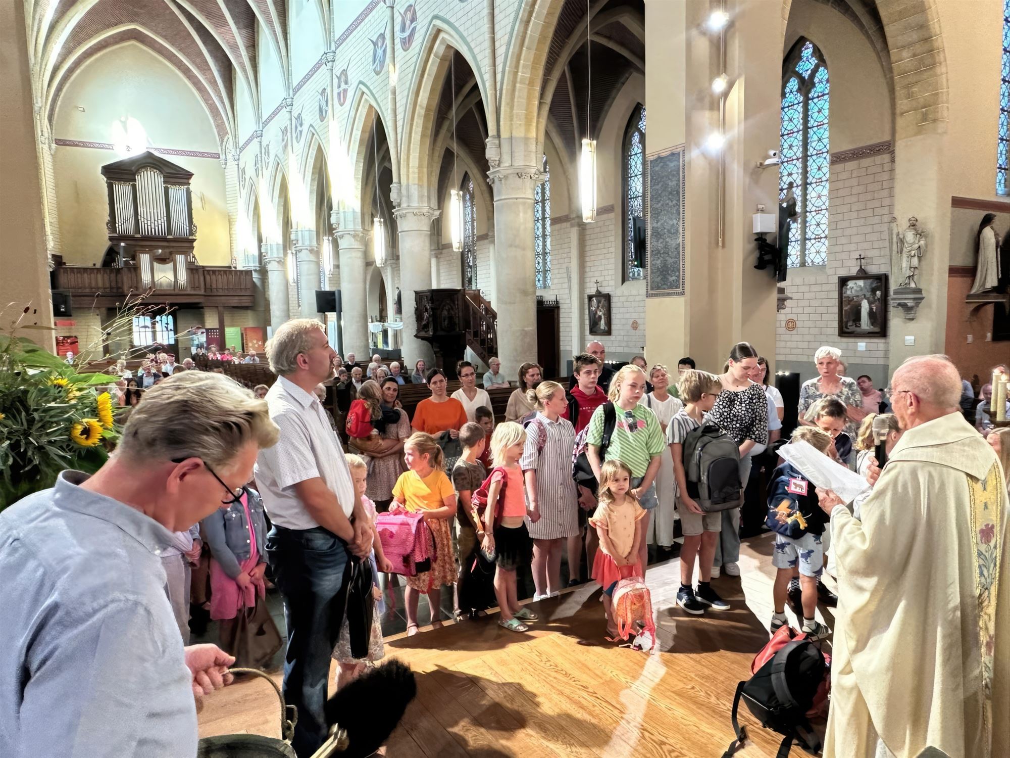 gezinsviering in de Sint-Pietersbandenkerk van Lommel-Centrum. Pater Maurits ging deze viering voor en zegende op het einde van de viering alle boekentassen van de kinderen, ouders en aanwezige schooldirecties.