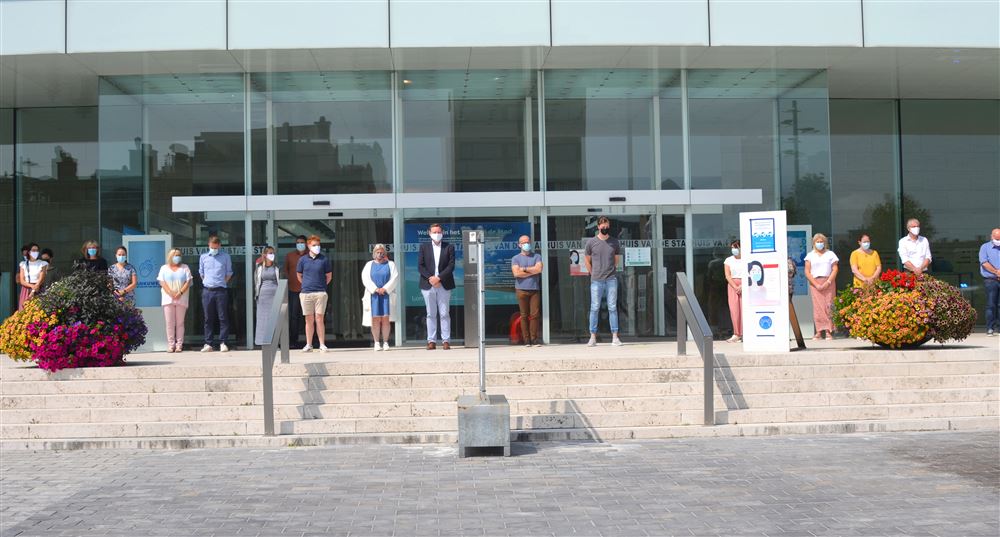 slachtoffers van de watersnood enkele dagen geleden. Aan het Huis van de Stad verzamelden dan ook het stadspersoneel, de politie en meerdere inwoners die gehoor gaven aan de oproep van de stad om hierbij aanwezig te zijn.