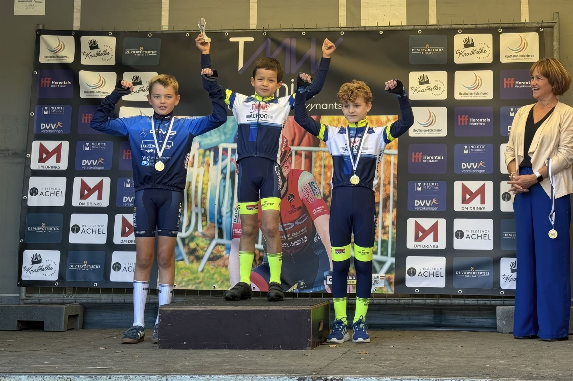 Nicolas Houben (laatste foto onder) verscheen aan de start, bij de jongste categorie U9. Hij werd er eerste op een heel mooi parcours en na een stevige sprint bergop, en scoorde daarmee een hattrick na eerdere winsten in Heide-Heuvel (Lommel) en Bel (Geel). Er waren 11 deelnemers in zijn categorie. Nicolas richt zich vanaf nu op het cyclocross seizoen samen met zijn ploeg Acrog-Tormans.