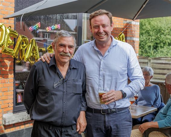 (foto), café ’t Bergske en de plaatselijke voetbalploeg 'de Motorclub' samen hun schouders onder hebben gezet. Burgemeester Bob Nijs gaf om 14 uur de aftrap met het passende liedje 'Lang zal ze leven'. Helaas was Gusta zelf wegens omstandigheden niet op haar eigen feest aanwezig. Maar dit mocht de pret niet drukken, want er was meer dan genoeg gratis drank voorzien, en voor de muzikale noot werd gezorgd door zangeres Lutgard. Een geslaagd feest!