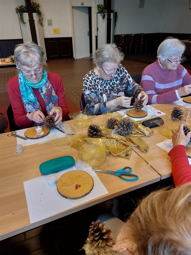 Samana Lommel-centrum samen in de Volksmacht. Terwijl de regen met bakken uit de hemel viel zaten ze gezellig samen te knutselen. Met fijne stoflapjes, kleine kersballetjes en andere mini kerst-attributen werd een kale dennenappel een prachtige