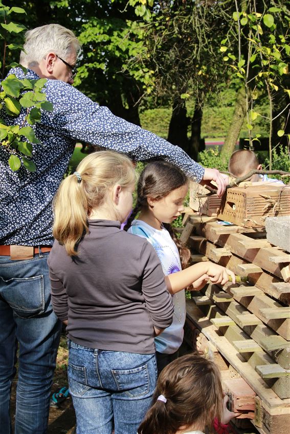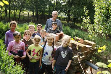 met kosteloos materiaal zoals dakpannen, stenen, hout, ... beginnen bouwen aan een insectenhotel waar onderaan ook egels kunnen overwinteren. In het voorjaar gaan ze dan een bloemenweide aanleggen rond het insectenhotel op dezelfde locatie. Fijn project!