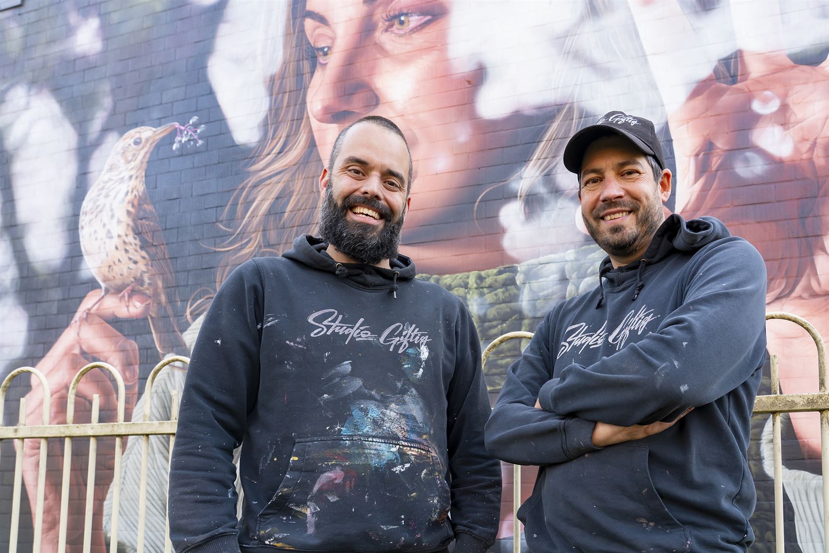 Niels en Kaspar van Studio Giftig. Opvallend: het werk kwam tot stand met actieve inbreng van de buurtbewoners.