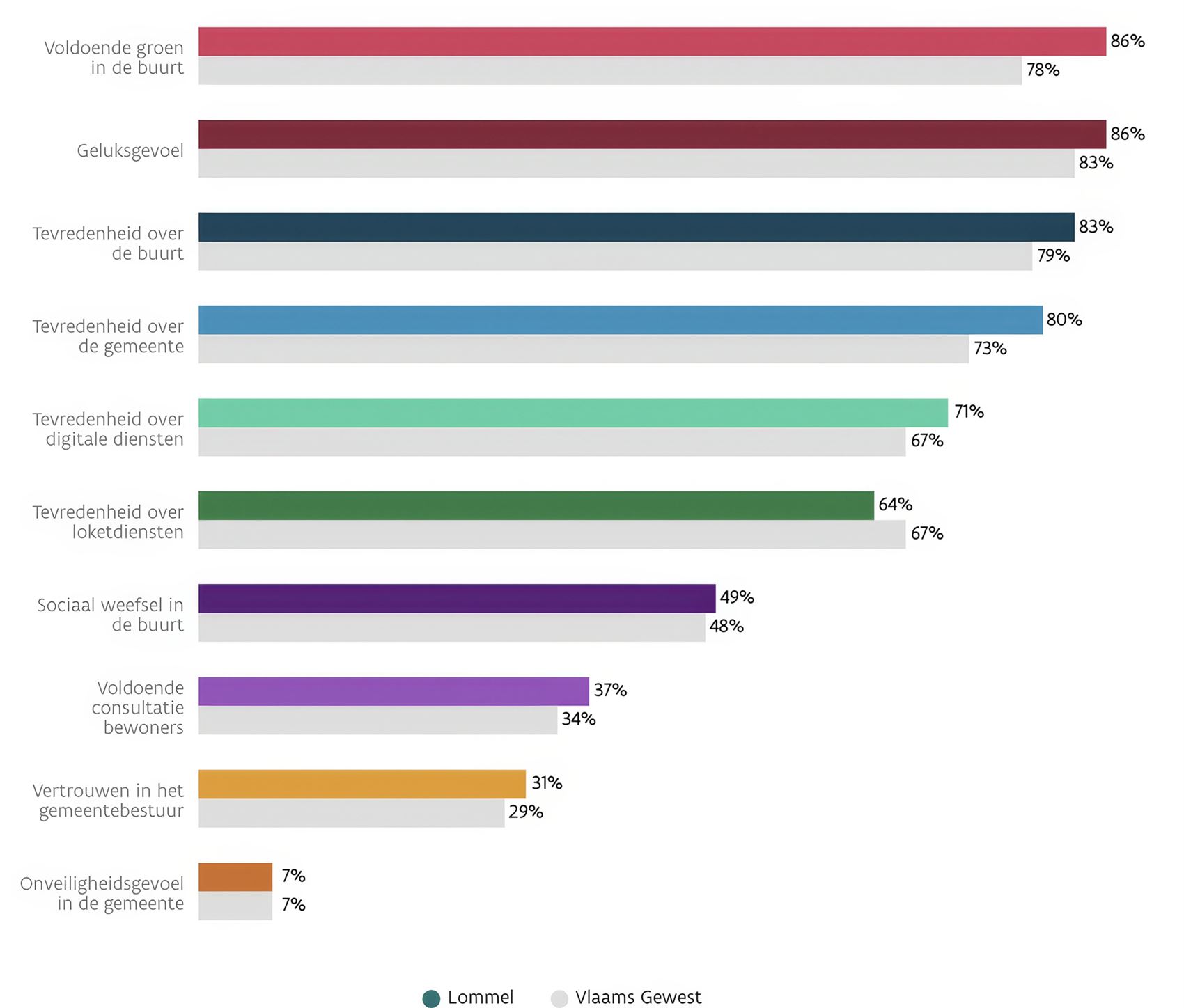 Lommel profileert zich als een groene, aangename en gelukkige stad om in te wonen, met scores die op heel wat domeinen boven het Vlaams gemiddelde uitstijgen. Tegelijk tonen de cijfers dat verdere inspanningen nodig blijven om het vertrouwen in het bestuur en de betrokkenheid van inwoners te versterken.