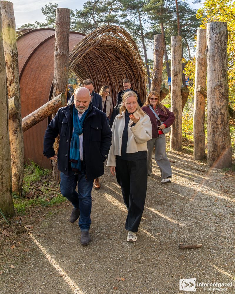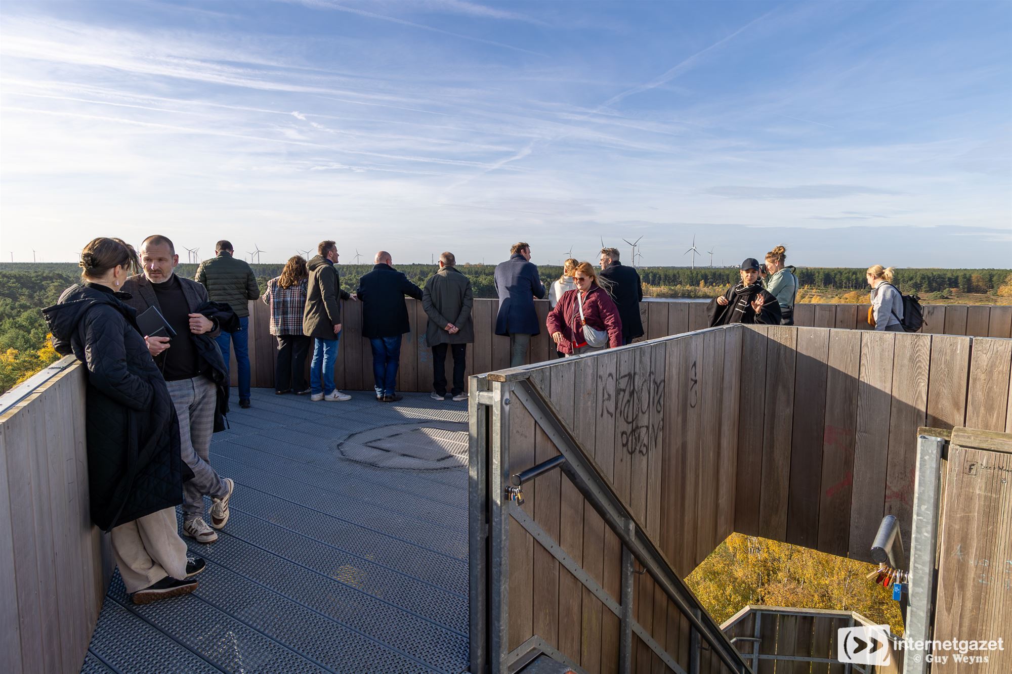 iconische houten uitkijktoren die hoog boven de kruinen van het bos uittorent. Boven op de 30 meter hoge constructie genoot de minister van het panoramische uitzicht over het uitgestrekte natuurgebied. Tijdens de wandeling terug was er tijd voor informele gesprekken en uitwisseling van ideeën over de toekomst van het park.
