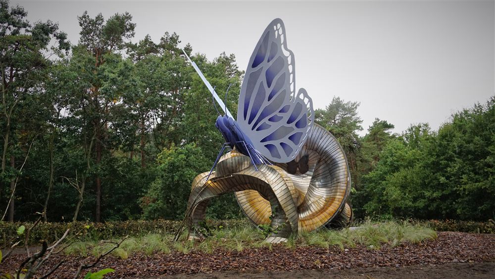 vlindersculptuur. Een werk van kunstenaar Will Beckers, die ook de vlinderwandeling langs het verharde wandelpad creëerde. Dit werk is het sluitstuk van de route én een schitterend herkenningspunt als je Lommel binnenrijdt. Vanmiddag werd dit kunstwerk plechtig onthuld met toespraken van burgemeester Vanvelthoven én van de kunstenaar, en bijdrages vanuit de Nieuwe Harmonie én enkele schoolkinderen uit Kattenbos.