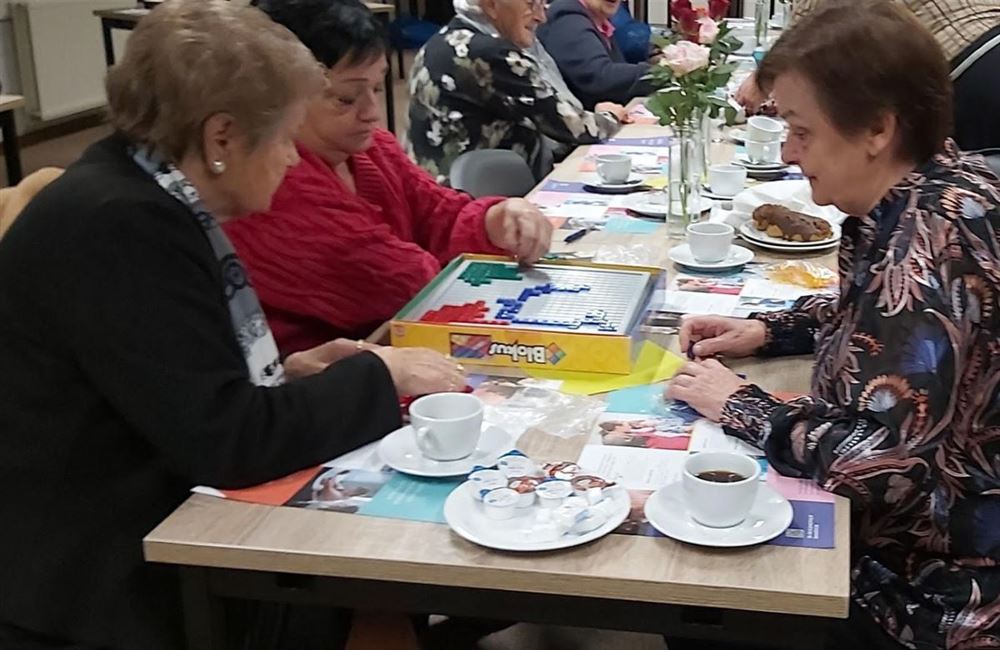 Ferm Kerkhoven van een gezellige bijeenkomst. Er werd gekeuveld, lekkere pistolets, sandwiches en gebak gegeten en nadien nog veel gelachen tijdens het spelen van gezelschapsspelletjes.