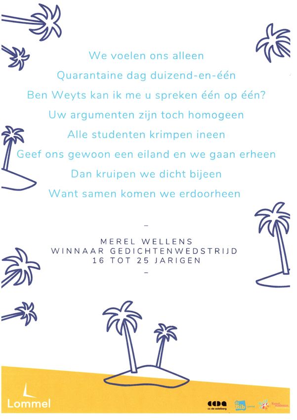Vanmiddag werden op de kiosk op het Marktplein de prijzen uitgereikt van de jaarlijkse poëziewedstrijd voor kinderen en jongeren. Iedere winnaar bracht zijn of haar gedicht, allemaal binnen het thema 'Samen'. Onderaan vindt u de drie winnaars van iedere categorie. Deze categorieën waren -12, van 12 tot 15 en +15. Een jury van de organisatoren, Stad Lommel, Openbare bibliotheek en CC De Adelberg had zich over de vele inzendingen gebogen, met dit als resultaat. In de categorie -12 werd Tuur Gerits winnaar, voor Laura Kimpe en Milo Cools. In de 12-15 categorie was het podium: eerst Joas Slits, tweede Niene Vanwijn en derde Jade Vander Mierde. En in de oudste categorie tot slot werd Merel Wellens de primus, vóór Lara La Lacona en Hannah Plumot. Proficiat aan alle winnaars én deelnemers! (Foto Jan Buyens)