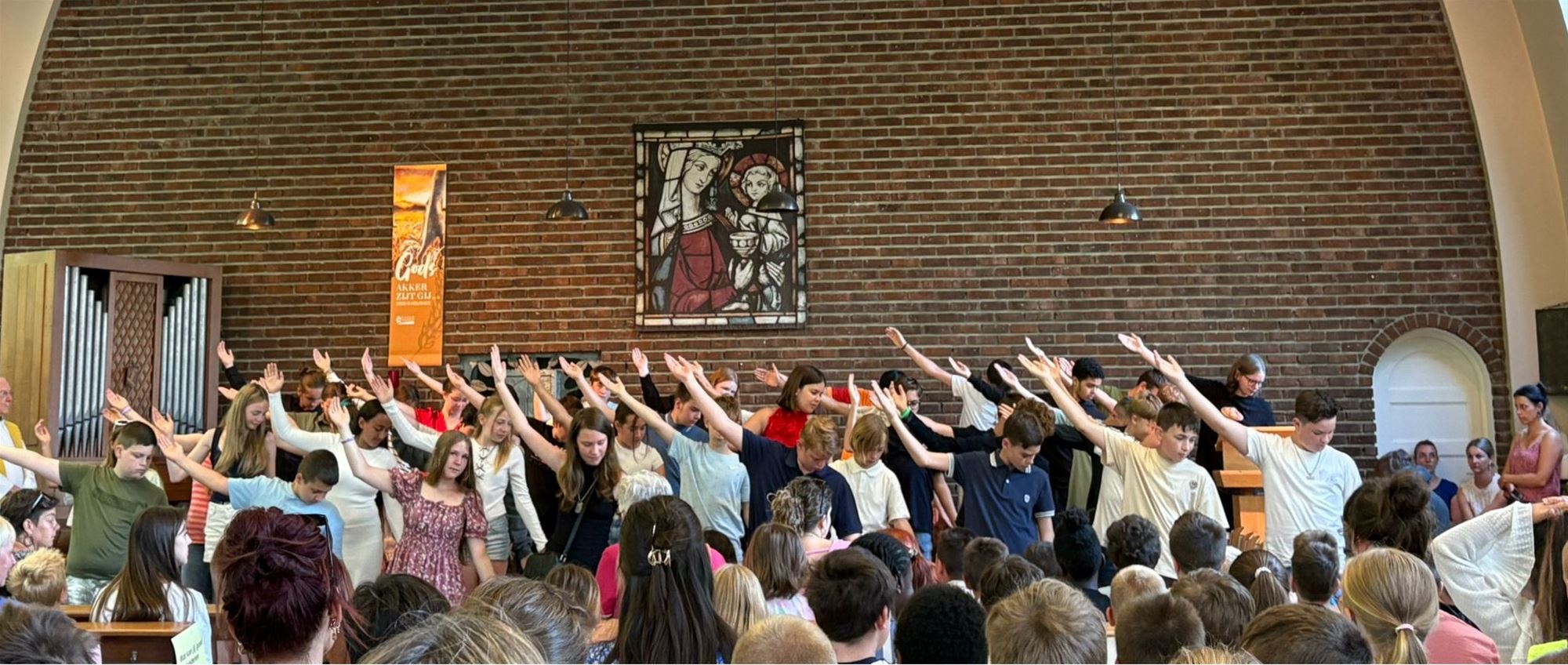 De dag begon met een sfeervolle viering samen met alle kinderen. Daarna volgde de jaarlijkse netbalwedstrijd: schoolverlaters tegen niet-schoolverlaters – een sportieve traditie vol plezier en gezonde competitie.