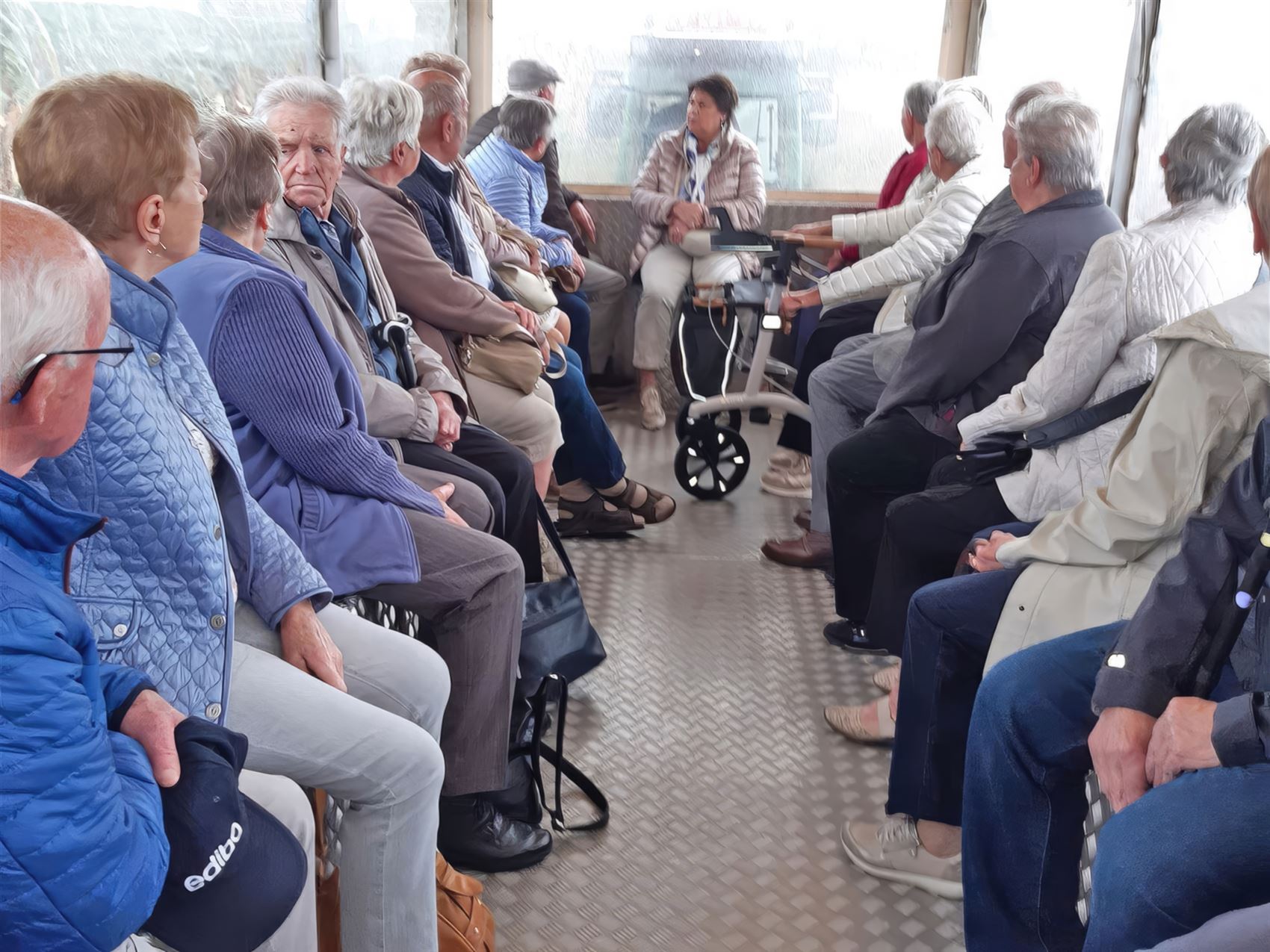 Na een warm welkom stapte de groep op het gezellige Pipo-treintje voor een rondrit in de omgeving, met deskundige uitleg van de eigenaar. Nadien gaf Veerle een boeiende toelichting over het ontstaan en de werking van het familiebedrijf. Afsluiten gebeurde met een proeverij van de verschillende appelsappen én de suikerarme confituur.