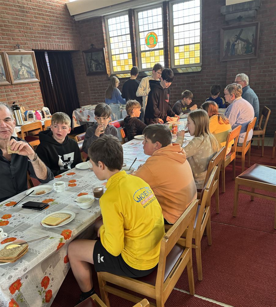De aanwezigheid van koster Pierre en pastoor Theo Borgermans zorgde voor een extra verbinding met de parochiegemeenschap. Doorheen het weekend namen de jongeren ook zelf verantwoordelijkheid op: tafels klaarzetten, afruimen en zorg dragen voor de kerkruimte. Zo werd “samen Kerk zijn” heel tastbaar.