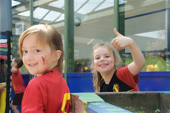 geweldig, coronaproof schoolfeest te organiseren in ‘Rode Duivels-thema’. Ouders konden er jammer genoeg niet bij zijn, maar wie het wou had een foto bij van zijn/haar familie en die foto’s hingen netjes aan de zijlijn. Zo konden mama en papa ook een beetje
