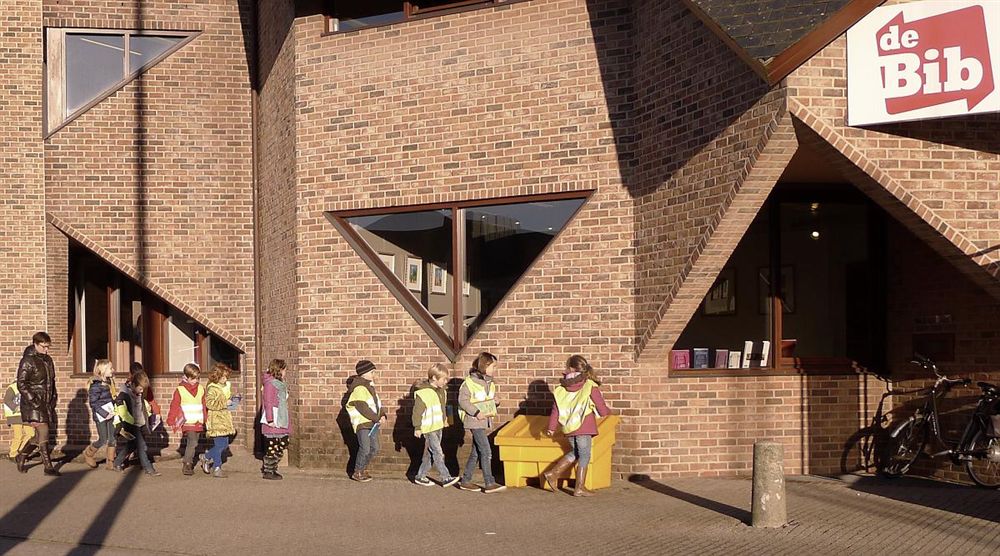 op het Michiel Jansplein: juf gaat met schoolkinderen naar de bib. Want vroeg beginnen met lezen maakt een straat verschil, later. De kinderen brachten hun boek binnen en mochten een ander uitkiezen. Sommigen kwamen lezend terug naar buiten...