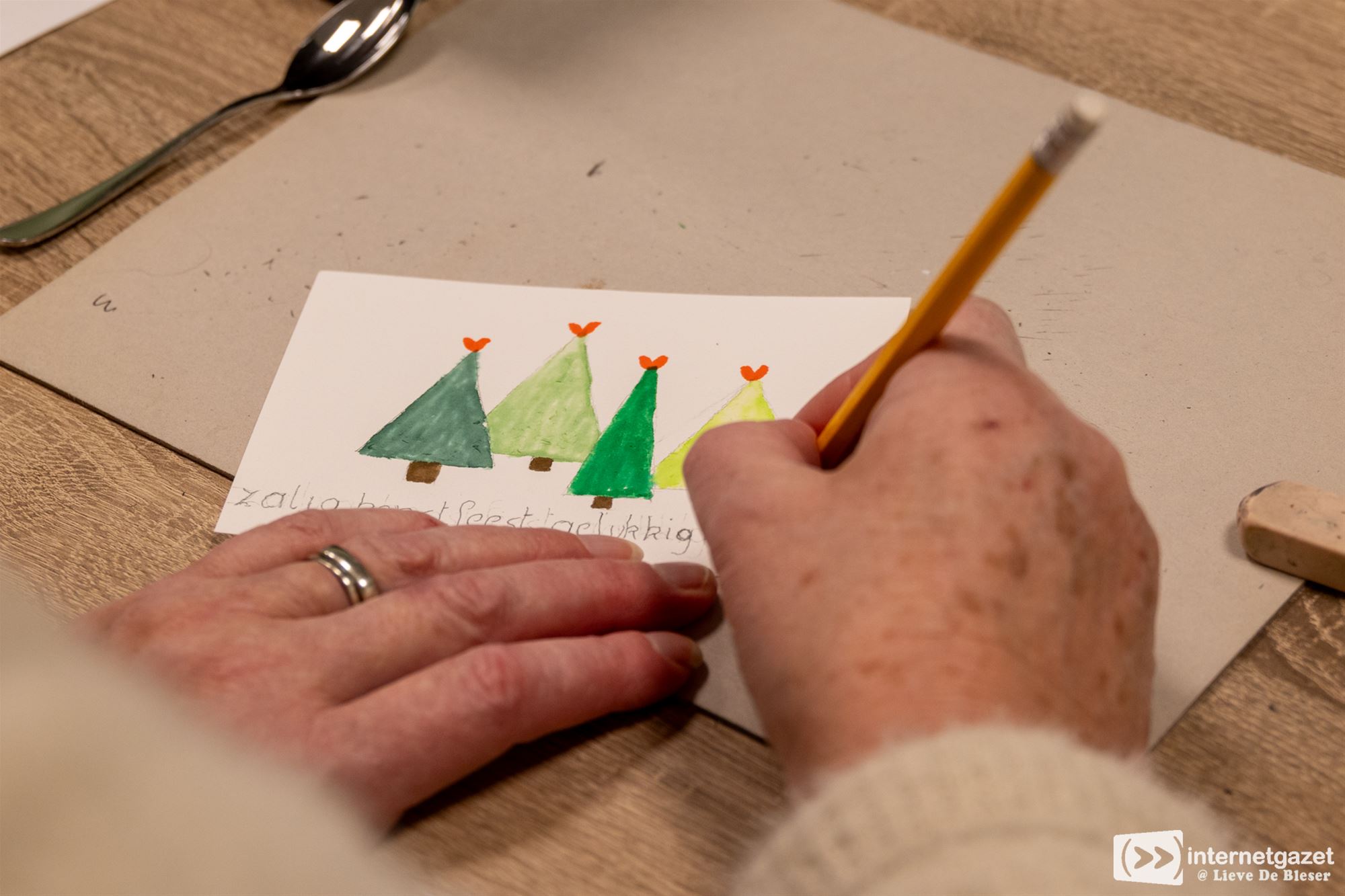 kerstkaartjes maken bij Gerda. Aan de hand van enkele voorbeelden, online of fysiek, gingen ze met potloden en aquarelstiften aan de slag om de mooiste kerstkaartjes te maken. Hun familie en vrienden kunnen zich tegen de kerstdagen verheugen op een origineel, zelfgemaakt kerstkaartje van de deelnemers.