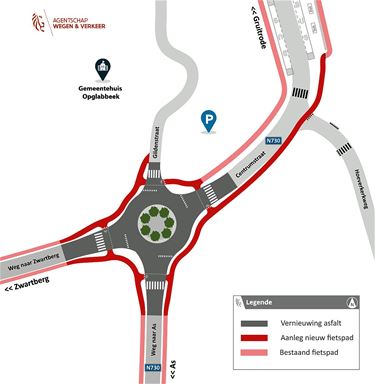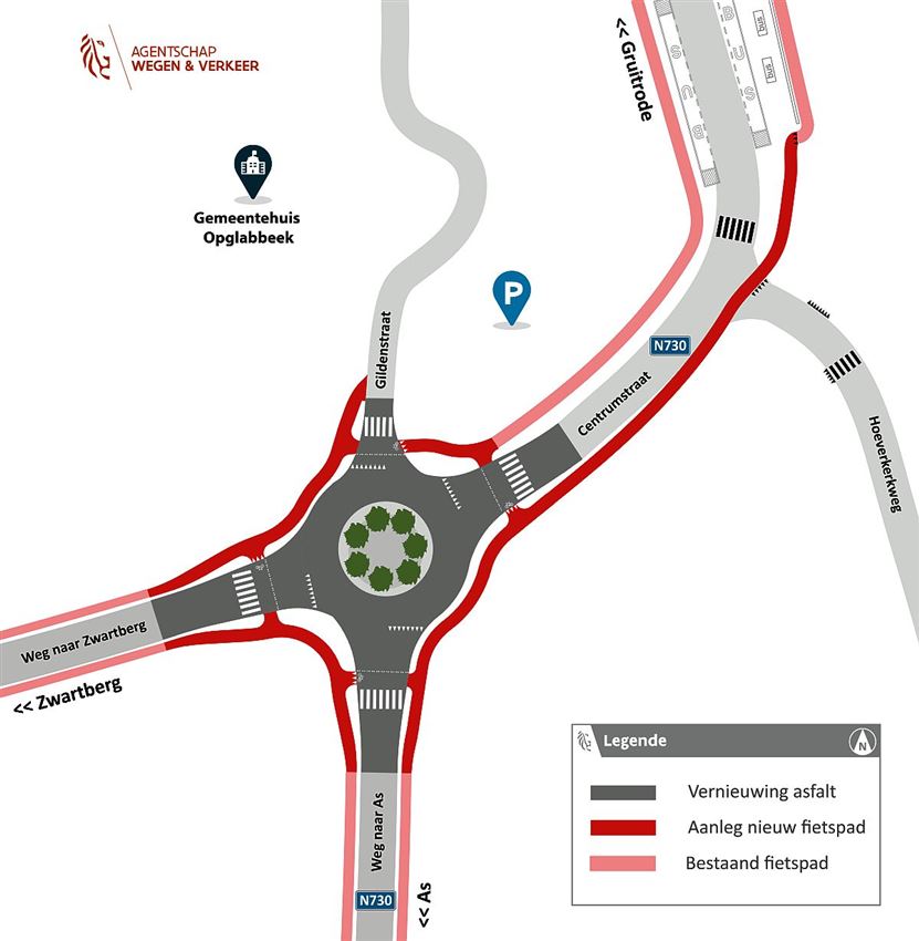 de rotonde in het centrum van Opglabbeek. Er komen vrijliggende fietspaden, vier veilige fietsoversteekplaatsen, verhardingen die de fietspaden scheiden van de rijweg en groene zones. De werken zullen zo’n