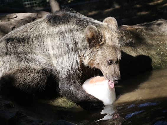 is het warm. Daarom werd er uitgepakt met fruitijsjes voor de apen, zalm-ijsjes voor de beren en kippenijsjes voor de leeuwen en de tijger.