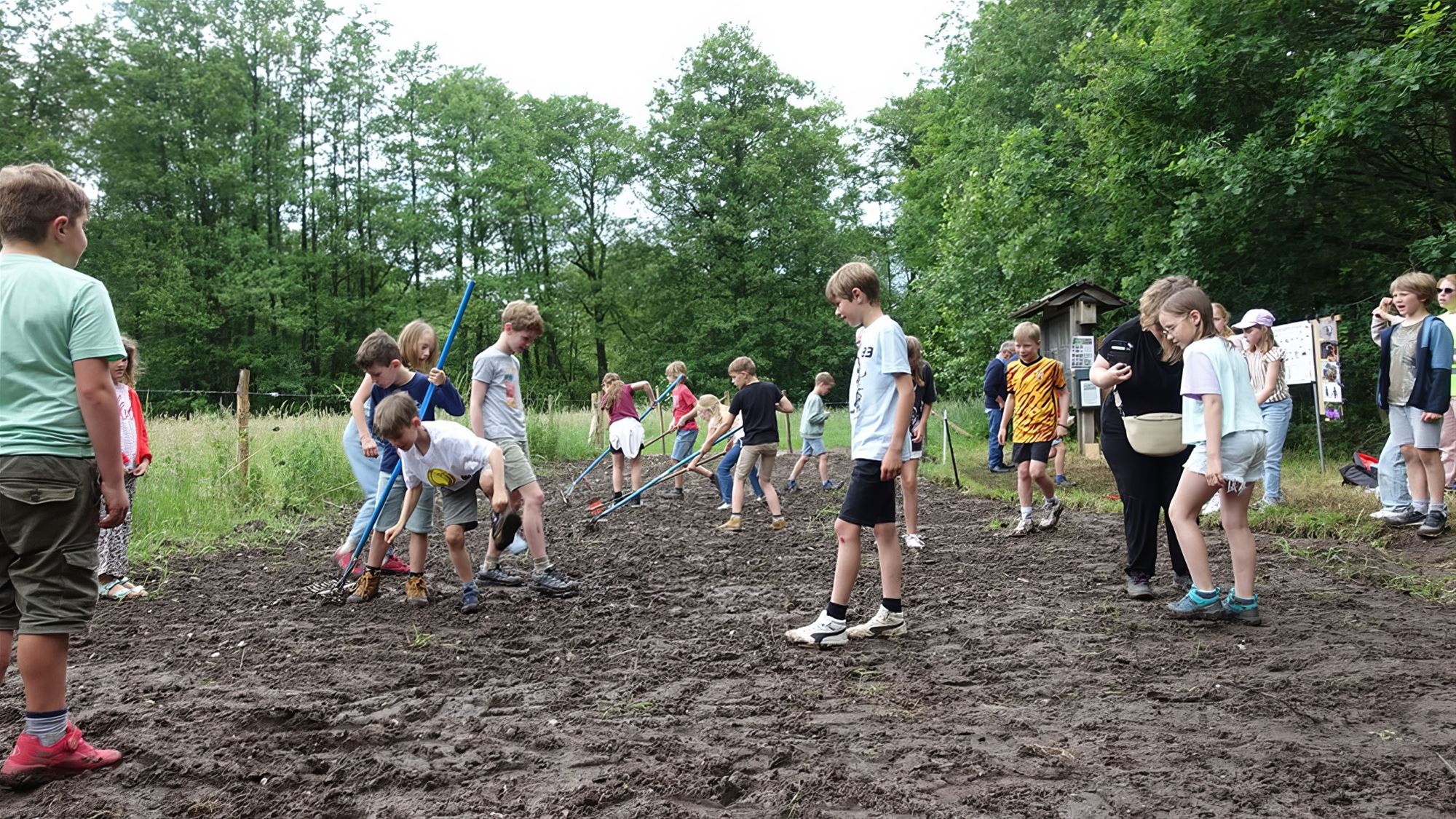 De 25 leerlingen van juf Annemie juf Sanne zochten aan het bijenhotel aan Meeuwerkant de wilde bijen uit, telden de bewoning en zaaiden het aanliggende perceeltje in met bloemen-mengsel. Aan de hand van afbeeldingen en voorafgaande lessen in de klas en met de hulp van imker Jan, de juffen en vrijwilligers van Natuurpunt werden