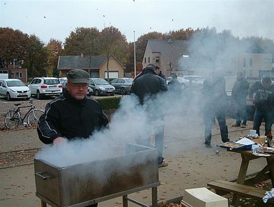 bij de Fit Lounge. Het was buiten bitter koud, maar iemand moest zich opofferen om het vlees te braden... En roken dat dat deed! Maar hij had het wellicht minder koud dan de anderen...