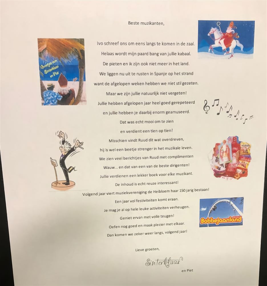 muziekvereniging de Heibloem niet vergeten. Er wachtte een leuke verrassing voor iedereen. Na het lezen van het mooie gedicht van de Sint, werd er volop gerepeteerd voor hun optreden op de Sint-Antoniusviering, dat zal op zondag 19 januari plaats vinden in 't Heem.
