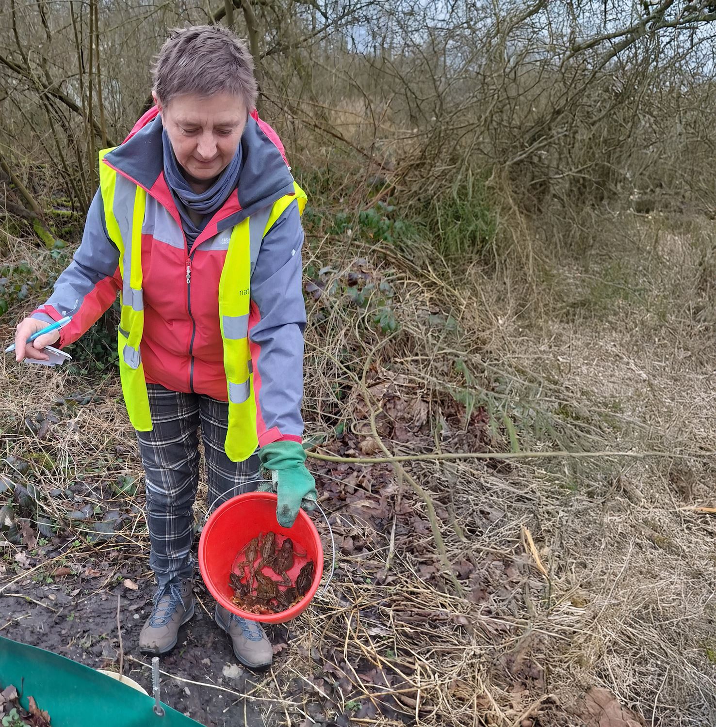 ’s Ochtends en ’s avonds controleert ze de opvangemmers langs de schermen en brengt ze de padden veilig naar de overkant. Een kleine moeite, maar met een grote impact voor de natuur in de Dommelvallei. (Foto Josh Vandijck)