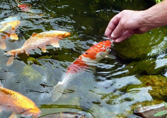 In een mooie tuinvijver aan de Kwikstraat komen de vissen zomaar uit je hand eten.
