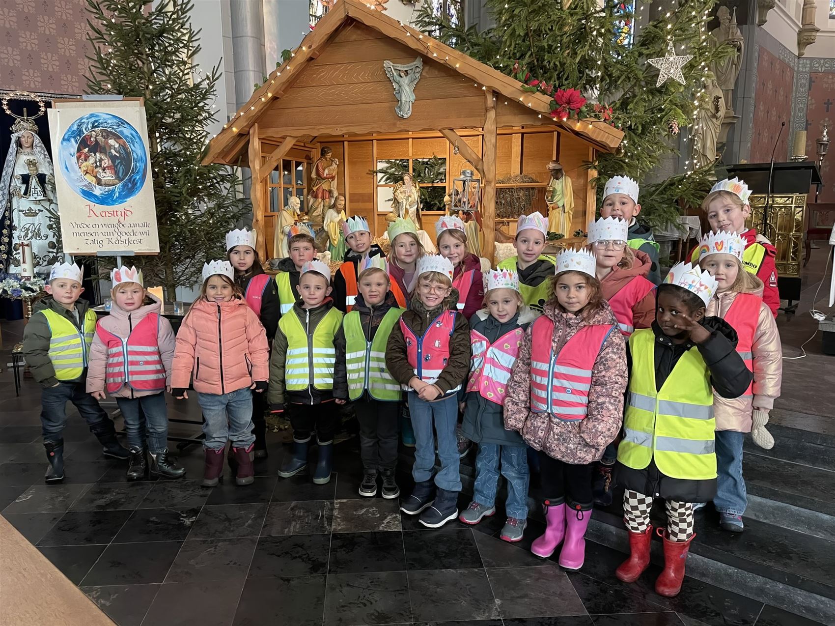 Daarna trokken ze naar de kerk, waar ze bij de mooie kerststal hun stemmen vrolijk lieten klinken. Een warm en kleurrijk moment, dat zorgde voor heel wat glimlachen.
