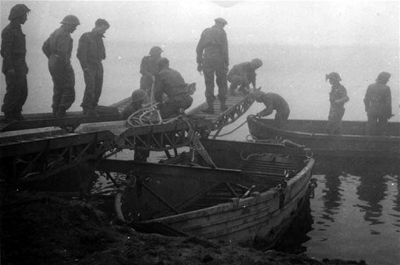 75 jaar geleden dat de Engelsen in SHLille het kanaal Bocholt-Herentals overstaken. Meer dan 50 Engelse en Duitse soldaten sneuvelden. Op de foto hierboven zien we het bouwen van een klasse 5-vlot en op die hieronder zien we het overzetten van een kanon met het vlot.