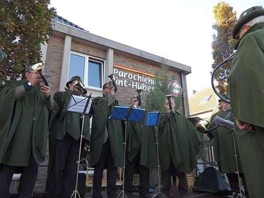 Sint-Hubertusviering in SHLille. Vele paarden, koetsen en honden met hun begeleiders stonden op het marktplein voor de zegening. De jachthoornblazers