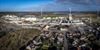 luchtfoto van Overpelt-Fabriek, anno 2022. Met op de voorgrond de woningen, vroeger veelal van mensen die in het fabriek hun brood verdienden, daarachter het huidige Nyrstar en, achter het nauwelijks zichtbare kanaal, de recente windturbines.