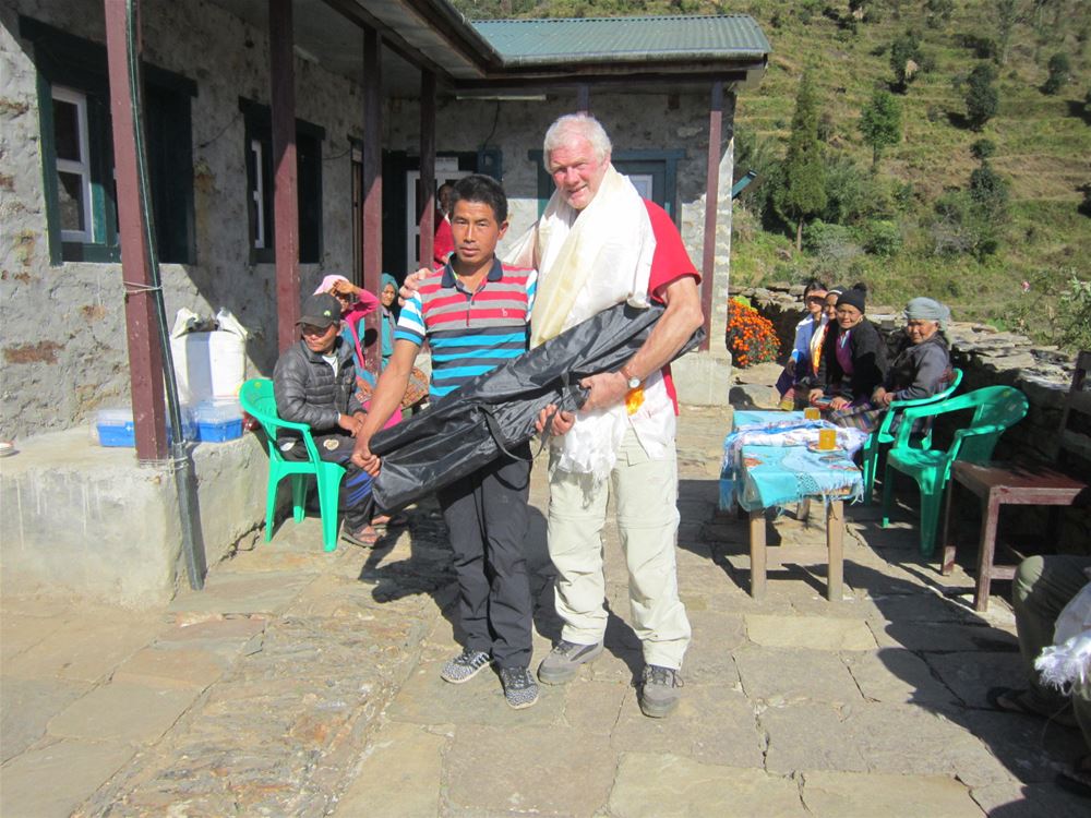 (links op de foto):"De regio waar ons project gelegen is, is zeer groot in oppervlakte. Om de hulppost te bereiken moeten de lokale mensen soms één dag stappen naar de hulppost om de draagberrie op te halen, dan weer terug en dan met de gekwetste weer terug om te behandelen. Nu besloten we om inklapbare aluminium lichtgewicht draagberries aan te kopen en deze te verdelen in de verschillende 'gehuchten'. Op onze tocht naar het gebied, twee dagen per jeep en dan vier dagen stappen, verdeelden we die EHBO-kasten met de nodige 'gebruikershandleiding' in de lokale schooltjes die we tegenkwamen. Dat ging telkens gepaard met de lokale vorm van dankbetuiging: we kregen kata's omgehangen, een zijden sjaal om de nek en de nodige lokale rijstdrank 'chang'."
