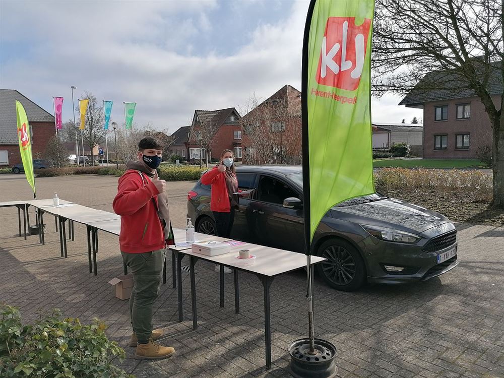drive-through afhaalactie. De mensen konden alles op voorhand bestellen en vandaag stond alles klaar om afgehaald te worden aan de parking van de kerk. Ondanks deze nieuwe formule werd de detergentactie toch weer een succes voor de jeugdbeweging en komen er toch enkel broodnodige centjes in de kas om hun activiteiten en kamp te kunnen bekostigen.