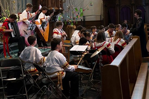 Op de foto het Russische ensemble "Balalaika" uit Dubna, dat een tweede prijs behaalde. Let even op die enorme