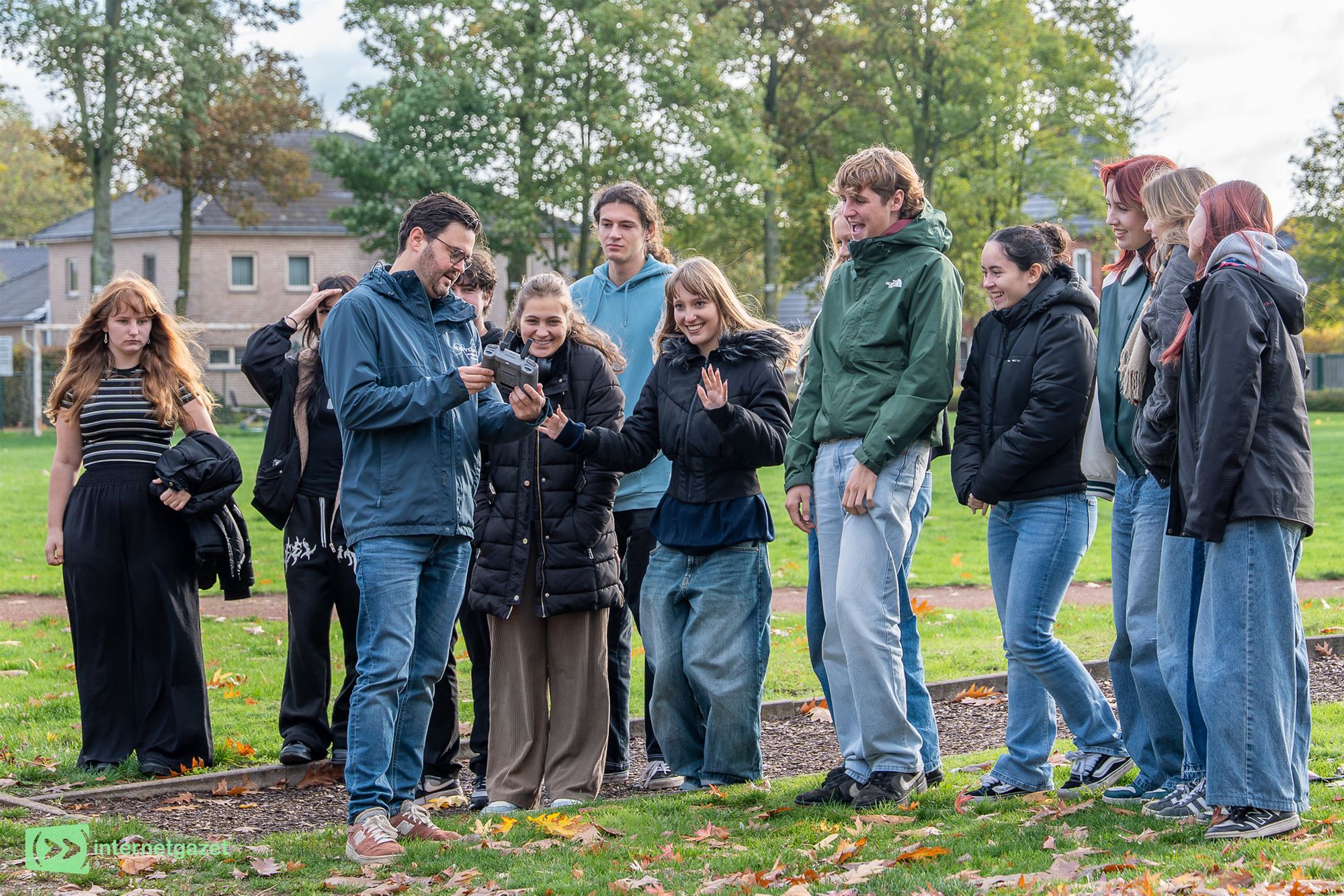 Na een inleidende sessie in het klaslokaal trok de groep naar buiten, waar Jens – met toestemming van de luchtmachtbasis van Kleine-Brogel – zijn drones de lucht in stuurde. De leerlingen konden zo van dichtbij ervaren wat er allemaal komt kijken bij het maken van luchtbeelden: van veiligheid en wetgeving tot kadrering en beweging.