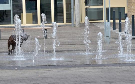 honden zijn er weg van, zoals deze labrador die we deze namiddag aan het werk zagen. Het bazinnetje probeerde hem aanvankelijk wat bij de les te houden, maar de drang naar de waterstralen was sterker...