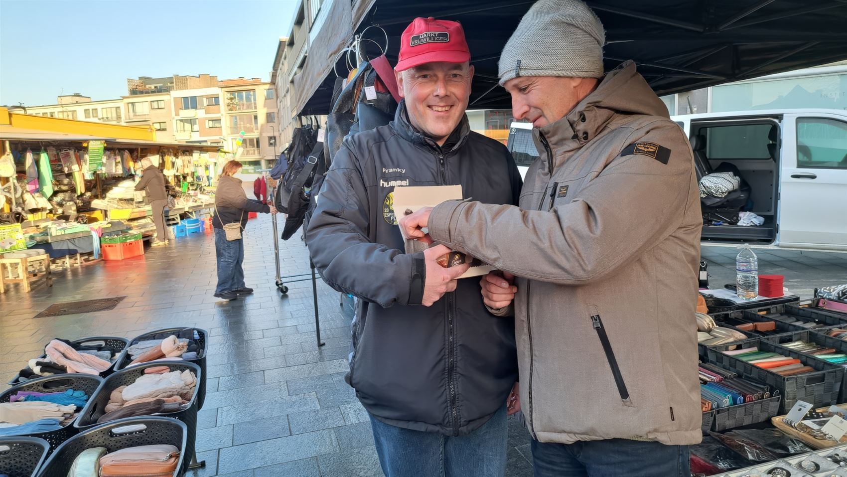 Franky Eerdekens zette een extra mooie toon op de zaterdagmarkt in Pelt. Voor zijn 44ste verjaardag trakteerde hij de marktkramers op een heerlijke praline.